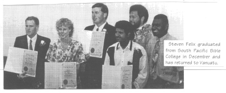 Kathy & I are excited that Paul and Miriam Vuhu will be arriving in January 1994 the begin their two years of training at SPBC to enable them to be better qualified to help their own people. Paul was a teacher in Port Vila and Miriam worked at a bank. This is a positive step as the brethren in Vanuatu take a more definite role in their own growth and maturity in the Lord.