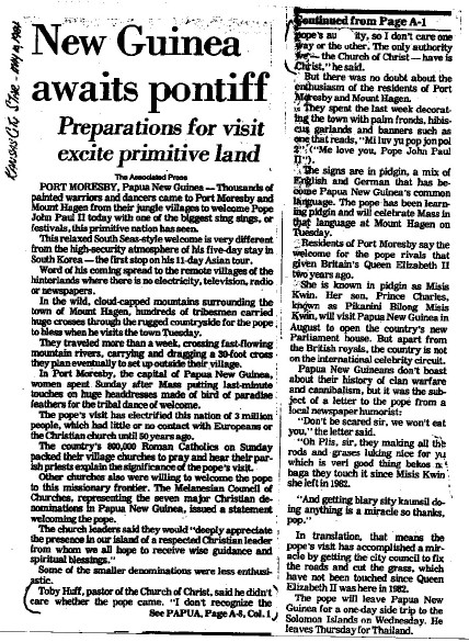 Several days before the Pope's arrival here in PNG the local Catholic run newspaper called up the different churches asking their views of the upcoming visit. The only reason they called me is that our telephone is listed first in the white page listing. I told them how we felt and they asked me if I knew who I was talking to, I replied yes and I still felt the same way. They published my comments in the local paper. The article was then picked up by the AP in the US and last week I received a copy of the Kansas City Star article from one of the sisters there at Gladstone Church of Christ. I received several thank you notes from religious groups here in PNG. So far I'm still here and have received no hate mail.